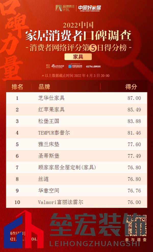 ??調(diào)查第5日,截至4月3日20時(shí),在家具榜單中,芝華仕家具以87.00分躍居第1,前一天排名第1的紅蘋果下滑至第2,第3名、第4名則仍由松堡王國(guó)、TEMPUR泰普爾占據(jù)。此外,進(jìn)入TOP10的品牌依次有雅蘭床墊、圣蒂斯堡、顧家家居全屋定制、絲漣、華意空間、Valmori富麗法雷爾等。>>點(diǎn)擊查看品類得分榜單