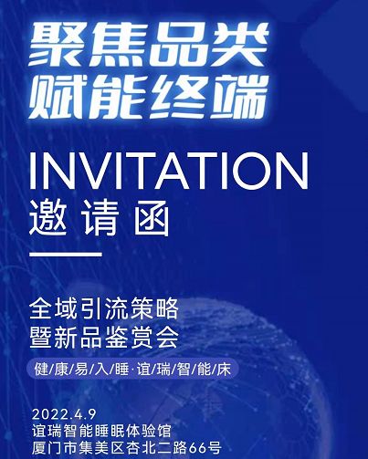 2022年4月9日,誼瑞健康家居將在廈門舉行首屆“聚焦品類,賦能終端”的招商交流會,現(xiàn)場大咖云集,深度解析智能睡眠領(lǐng)域財富密碼,在全新的市場經(jīng)濟背景下如何做好線上引流,如何線下門店管理,快速入局大健康產(chǎn)業(yè)。