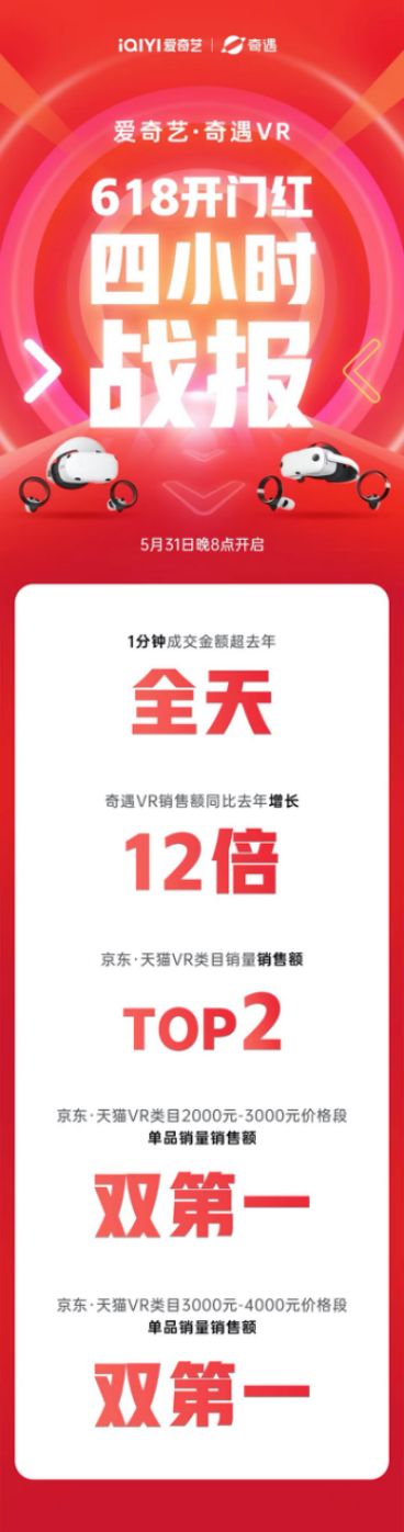 | 5月31日晚8點,618電商盛典火爆開啟。作為時下最in的科技產(chǎn)品,VR一體機受到廣大消費者的瘋搶。以國產(chǎn)VR頭部品牌奇遇VR為例,昨晚618開門紅僅1分鐘,其成交金額就輕松超過去年同期的全天銷量。截止當晚24點,奇遇VR銷量較去年同比增長12倍!與此同時,還斬獲京東、天貓VR類目銷量及銷售額第二,以及雙平臺2000-3000元及3000-4000元價格段的單品銷量&銷售額的雙料冠軍。