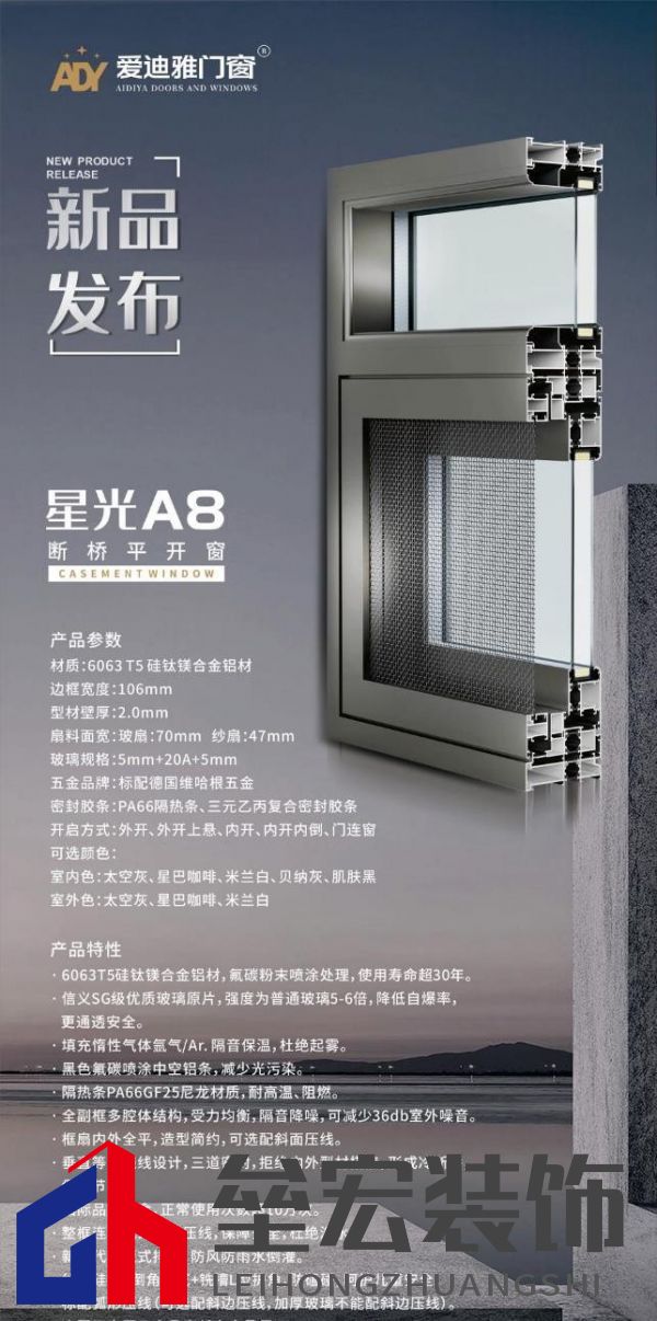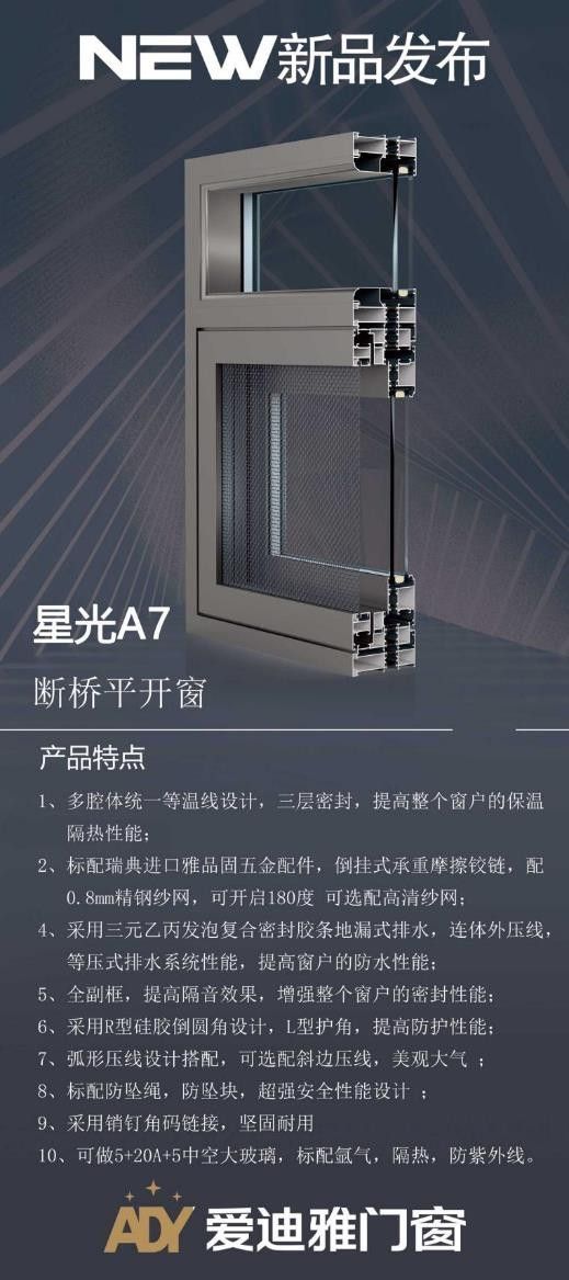 星光A7斷橋窗紗一體平開窗,邊框采用幕墻式結(jié)構(gòu),外形美觀,并且室外的那一面不易積塵,積水,長年以來易打理,清潔干凈。窗扇采用304不銹鋼摩擦鉸鏈,裝配0.8mm不銹鋼金剛紗,配備質(zhì)量優(yōu),使用久了不易磨損。這款產(chǎn)品時尚大氣,適合高端家裝市場。 榮耀V6斷橋平開窗,內(nèi)外平框,隱藏排水功能,其中設(shè)定科學(xué)水流路徑,雨天排水更加順暢,避免堵塞。設(shè)有高強度防護(hù)欄,由高密度鈦鎂鋁合金打造,既能防盜又能防護(hù),保護(hù)家人安全。造型獨特,美觀大氣,整個空間都會顯得很寬敞,將自然美景收入家中。