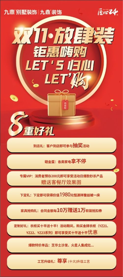24年來,九鼎裝飾立足浙江,自成立以來,九鼎裝飾秉持“口碑相傳,永續(xù)經(jīng)營”的理念,堅(jiān)持匠心精神,以優(yōu)秀的設(shè)計(jì)、嚴(yán)格的管理、精湛的工藝、環(huán)保的材料和真誠的服務(wù),讓每一位客戶都享受到獨(dú)特而快樂的裝修之旅。 “雙十一.放肆裝”百城聯(lián)動(dòng)到來之際,九鼎裝飾總部將聯(lián)合全國各城市公司隆重推出雙11鉅惠慶典,以勁爆活動(dòng)答謝您一路來的不離不棄。 八重好禮鉅惠享不停 到店禮:客戶到店即可參與抽獎(jiǎng)活動(dòng) 砸金蛋:各類家電拿不停 專屬VIP:消費(fèi)者預(yù)存200元即可享受活動(dòng)日爆款秒殺產(chǎn)品 贈(zèng)送客餐廳效果圖 下定禮:下定即可獲得價(jià)值1980元恒源祥蠶絲被一床 家具搶購禮:合同金額每日一題萬贈(zèng)送1萬軟裝抵扣券 定制好禮:衣柜買十平送十平!活動(dòng)期間,購買金牌衣柜(YZ21、YZ22、YZ23系列)即可享受買十平送十平優(yōu)惠 爆款特價(jià)單品:芝華士沙發(fā)、火星人集成灶 工藝升級(jí)禮:尊享(十大)升級(jí)工藝