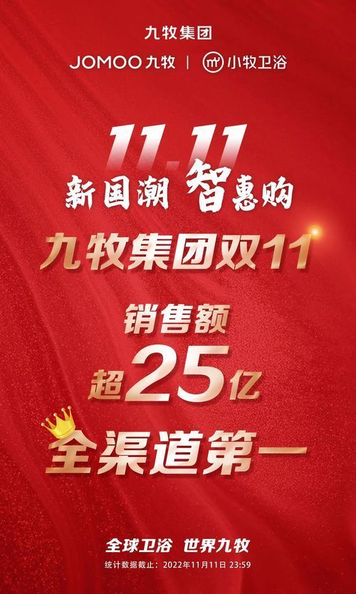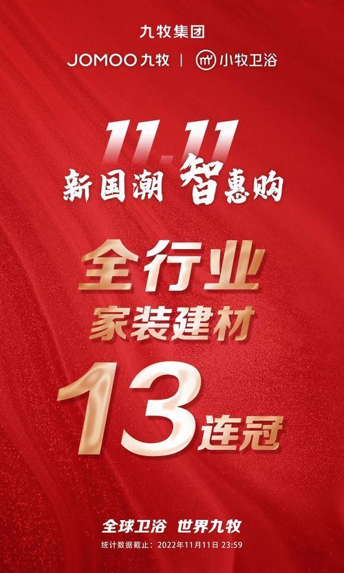 新國(guó)潮,智惠購(gòu) 2022年雙11九牧再創(chuàng)佳績(jī) 銷售額累計(jì)超25億 全渠道第一 穩(wěn)奪全行業(yè)家裝建材“十三連冠” 一路領(lǐng)跑續(xù)寫傳奇,彰顯品牌實(shí)力!
