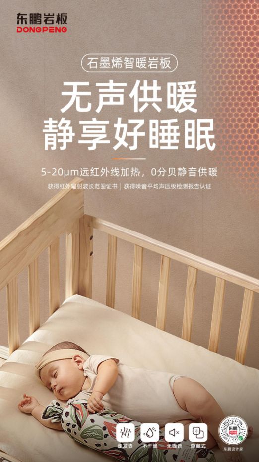 ??無聲供暖、安心入睡 ??傳統(tǒng)取暖設(shè)備在使用時會發(fā)出噪音,為了創(chuàng)造一種安靜、舒適、溫暖的空間體驗,東鵬石墨烯智暖巖板通過5-20μm中遠紅外線與對流方式加熱,實現(xiàn)無聲發(fā)熱,呵護每一位家人的睡眠。