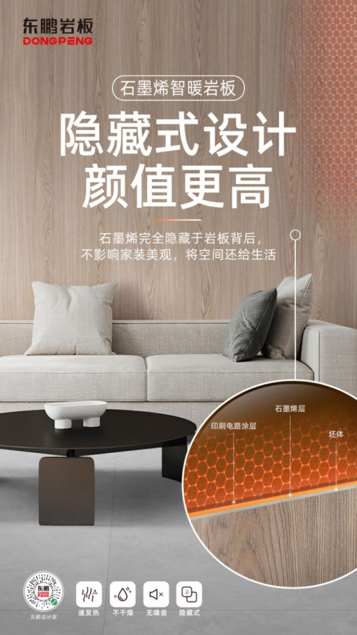 ??石墨烯智暖巖板還有強效抗菌、滅病毒、滅螨蟲的功效,通過釋放遠紅外線,持續(xù)運行對表面附著病毒的活性進行抑制,從而達到抑菌的效果,金黃色葡萄球菌、大腸桿菌5小時殺滅率99%以上,能夠帶來潔凈的效果。 ??石墨烯智暖巖板不僅可以應(yīng)用在家居空間中,還可廣泛應(yīng)用于醫(yī)療空間上,例如,醫(yī)院病房空間、月子中心、老人中心、理療中心等場所,其均勻散熱并不會帶來任何聲音,輔佐理療與抑菌的性能,能夠為病患帶來舒適、安靜的康養(yǎng)環(huán)境。 ??“可持續(xù)發(fā)展”已成為全球性議題,東鵬持續(xù)以創(chuàng)新技術(shù)與產(chǎn)品踐行低碳發(fā)展戰(zhàn)略,解碼綠色可持續(xù)發(fā)展路徑,始終秉承著“融合科技藝術(shù)、締造美好人居”的品牌發(fā)展理念、積極踐行低碳綠色發(fā)展戰(zhàn)略,推動行業(yè)高質(zhì)量發(fā)展。