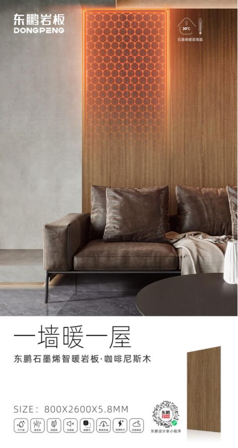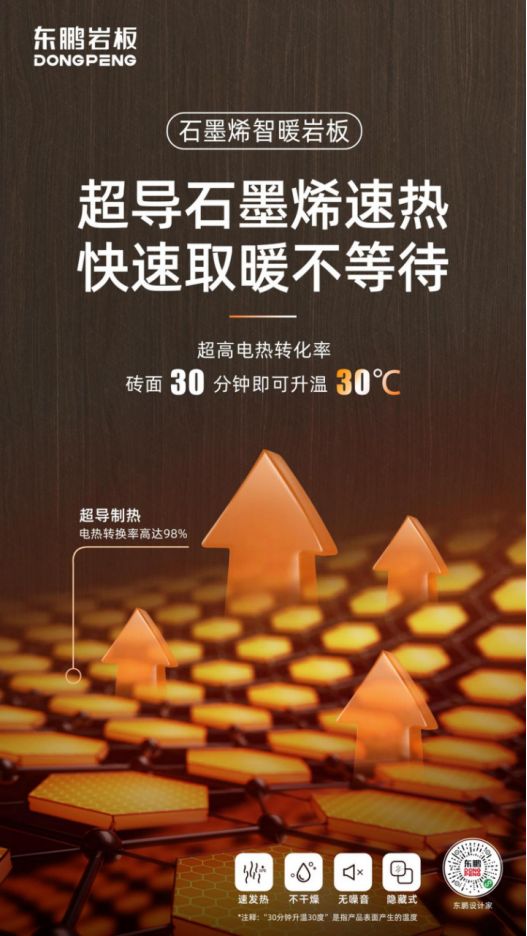 ??東鵬集團創(chuàng)新性地將石墨烯材料應(yīng)用于巖板中,融合設(shè)計、藝術(shù)與可持續(xù)發(fā)展的理念,打造出暖冬黑科技 - 石墨烯智暖巖板,用科技創(chuàng)新為千萬家庭提供溫暖保障。 ??石墨烯,是一種具備高導(dǎo)熱性、高導(dǎo)電性、超薄性能、高強度、高熱穩(wěn)定等特點的新材料,它被廣泛應(yīng)用在高科技領(lǐng)域,例如航空航天,新能源汽車等,被認(rèn)為是一種未來革命性的材料。 ??東鵬集團研發(fā)出石墨烯3D大面積超導(dǎo)制熱技術(shù)并運用于智暖巖板中,將巖板、智能石墨烯發(fā)熱涂層、防水絕緣高密封裝三層保護設(shè)計,打造出集裝飾性和功能性為一體的產(chǎn)品。 ??石墨烯巖板的誕生,重新定義了新時代的取暖方式。它可以是建筑材料,應(yīng)用于眾多家庭場景中,如墻面、地暖、桌椅、操作臺面等,它也可以是家電,高效發(fā)熱、暖而不燥、環(huán)保節(jié)能,功能超越瓷磚,真正做到一墻暖一屋。 ??高效制熱,超低能耗 ??東鵬石墨烯智暖巖板采用石墨烯3D大面積超導(dǎo)熱技術(shù),以超強導(dǎo)熱性能的石墨烯作為發(fā)熱源,發(fā)熱快、效率高、制熱均勻,電熱轉(zhuǎn)換效率高達98%以上,導(dǎo)熱系數(shù)高達5300W/mk,產(chǎn)品開啟后表面迅速升溫,30分鐘磚面即可升溫30℃,即開即用,溫暖更省電,享受不一樣的舒心。