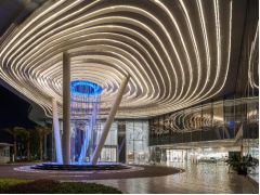 珠海環(huán)宇城的外立面以多層次的波浪紋呼應(yīng)海洋主題 裙樓設(shè)計以海洋作為靈感,與帆船形態(tài)的塔樓設(shè)計相呼應(yīng)。波紋折板、浪花型的穿孔鋁板等飾面配合簡潔流暢的線條突出現(xiàn)代輕奢感。入口以海浪元素為設(shè)計靈感,臨河一面的圓弧形線條宛如層層疊疊的波紋,加上造型各異的頂棚,讓人有種踏入海浪的互動感。夜幕降臨后,在燈光的烘托下,人們仿佛沉浸于寧靜而斑斕的海洋世界。