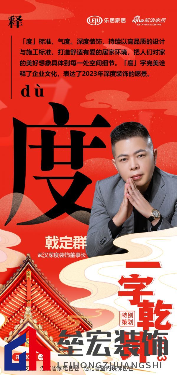 在新浪家居“2023一字乾坤”活動(dòng)中,深度裝飾董事長(zhǎng)戟定群:「度」標(biāo)準(zhǔn),氣度。深度裝飾,持續(xù)以高品質(zhì)的設(shè)計(jì)與施工標(biāo)準(zhǔn),打造舒適有愛(ài)的居家環(huán)境,把人們對(duì)家的美好想象具體到每一處空間細(xì)節(jié)?!付取棺滞昝涝忈屃似髽I(yè)文化,表達(dá)了2023年深度裝飾的愿景。 “以漢字賦能湖北家居企業(yè),彰顯厚積薄發(fā)之力”,以單字抒寫(xiě)了各家企業(yè)及媒體的新年愿景與發(fā)展信條,領(lǐng)略楚風(fēng)漢韻下湖北家居人砥礪向前,揚(yáng)帆未來(lái)的決心與動(dòng)力,情暖兔歲,新啟華章。 |