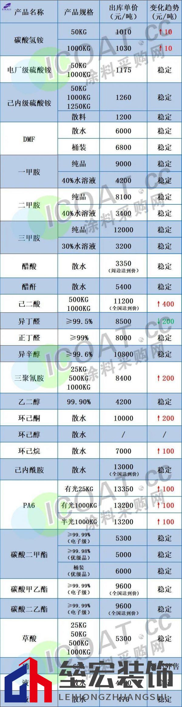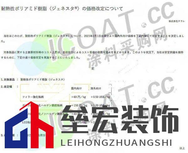 (上海華誼新材料1月29日產(chǎn)品報價表) 華魯恒升己二酸掛牌價調(diào)漲400元,報11200元/噸送到。 石家莊柏坡正元液氨調(diào)漲30元,報4250元/噸。 利華益維遠(yuǎn)化學(xué)苯酚產(chǎn)品出廠價格上調(diào)100元/噸,執(zhí)行7800元/噸。 大連恒力丁二烯價格上調(diào)200元/噸至8710元/噸。 神華寧煤丁二烯價格上調(diào)300元/噸至8400元/噸。 山東地區(qū)醋酸企業(yè)周邊送到價在3050元/噸左右,假期市場價格上調(diào)100元/噸。 利華益異辛醇價格上漲500元/噸,報10400元/噸。 華魯恒升異辛醇價格上漲500元/噸,報10800元/噸。 利華益維遠(yuǎn)化學(xué)丙酮產(chǎn)品出廠價格上調(diào)200元/噸執(zhí)行5200元/噸。 上海巴斯夫TDI 1月結(jié)算價19300元/噸,2月掛牌25000元/噸,環(huán)比上調(diào)4000/噸。 可樂麗株式會社發(fā)布調(diào)價通知,自2023年2月1日起,填料強化品種和玻璃纖維強化鹵素阻燃品種國內(nèi)漲60日元/kg,國外市場漲0.5美元/kg(約合人民幣3392元/噸);玻璃纖維強化鹵素阻燃品種國內(nèi)漲150日元/kg,國外市場漲1.2美元/kg(約合人民幣8184元/噸);LED品種國內(nèi)漲300日元/kg,國外市場漲2.3美元/kg(約合人民幣15604元/噸)。  信息來源:涂料采購網(wǎng) 封面圖:立邦官網(wǎng) |