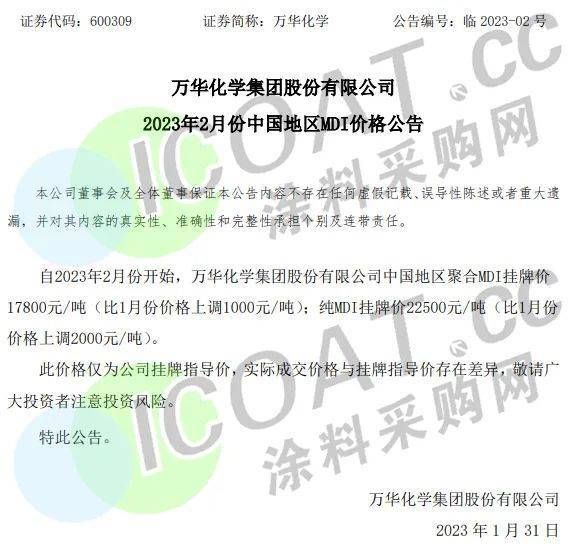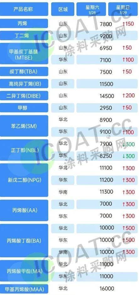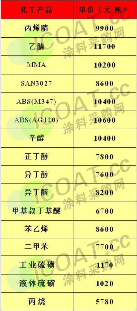 | 據(jù)涂料采購網(wǎng)了解,乳液產(chǎn)業(yè)鏈上的甲苯、二甲苯、丙二醇、乙二醇二醚、苯乙烯等均出現(xiàn)價格上漲的情況,最高上漲超過10%;樹脂產(chǎn)業(yè)鏈上的液體環(huán)氧樹脂、新戊二醇均有上漲,雙酚A也在近幾日以噸價上漲百元的速度迎頭趕上;鈦白粉行業(yè)已有龍頭企業(yè)報價上調(diào),廠家當(dāng)前仍處于檢修中,行業(yè)供應(yīng)小幅收緊。2023年,在原材料價格上漲的趨勢之下,涂料企業(yè)的發(fā)展重點將會放在降本增效方面。具體原材料情況整合如下: 近日,萬華化學(xué)發(fā)布公告,自2023年2月份開始,公司中國地區(qū)聚合MDI掛牌價17800元/噸 (比1月份價格上調(diào)1000元/噸); 純MDI掛牌價22500元/噸 (比1月份價格上調(diào)2000元/噸)。  而在此前, 巴斯夫宣布對東盟和南亞地區(qū)的MDI基礎(chǔ)產(chǎn)品進(jìn)行漲價, 漲價幅度為300美元/噸(約合人民幣2026元/噸),即日起生效,這也揭開了近期MDI產(chǎn)業(yè)的上漲序幕。  據(jù)公開數(shù)據(jù),印度地區(qū)目前已有MDI廠家對聚合MDI報盤上調(diào)至1850美元/噸,相較于中國農(nóng)歷新年前的1700美元/噸上漲150美元/噸。 萬華、利華益、華魯恒升等龍頭領(lǐng)漲,40多種化工品價格調(diào)漲! 春節(jié)之后剛剛開工,化工產(chǎn)業(yè)也在一片呼聲中開始拉漲,40多種化工品價格上漲。 丁二烯目前報價8845元/噸,較月初報價上漲1603.75元/噸,漲幅22.15%; 異丁醛目前報價7933.33元/噸,較月初報價上漲1366.66元/噸,漲幅20.81%; 丙烷目前報價6137.5元/噸,較月初報價上漲1055元/噸,漲幅20.76%; MIBK目前報價17733.33元/噸,較月初報價上漲2966.66元/噸,漲幅20.09%; 1,4-丁二醇目前報價11290元/噸,較月初報價上漲1510元/噸,漲幅15.44%; 甲苯目前報價6590元/噸,較月初報價上漲670元/噸,漲幅11.32%; 己內(nèi)酰胺目前報價11966.67元/噸,較月初報價上漲900元/噸,漲幅8.13%; 加氫苯目前報價7100元/噸,較月初報價上漲533.33元/噸,漲幅8.12%; 純苯目前報價7015.5元/噸,較月初報價上漲483.33元/噸,漲幅7.40%; PX目前報價8000元/噸,較月初報價上漲550元/噸,漲幅7.38%; 二甲苯(溶劑級)目前報價7375元/噸,較月初報價上漲500元/噸,漲幅7.27%; 苯乙烯目前報價8516.67元/噸,較月初報價上漲516.67元/噸,漲幅6.46%; 丙二醇目前報價7866.67元/噸,較月初報價上漲466.67元/噸,漲幅6.31%; 三氯甲烷目前報價2400元/噸,較月初報價上漲137.5元/噸,漲幅6.08%; 環(huán)己酮目前報價9690元/噸,較月初報價上漲470元/噸,漲幅5.10%; 碳酸二甲酯目前報價4900元/噸,較月初報價上漲233.33元/噸,漲幅5.00%。 2023年1月部分化工品漲價榜 (單位:元/噸)  (以上數(shù)據(jù)來源于涂料采購網(wǎng)信息中心,如有差池請以實際數(shù)據(jù)為準(zhǔn)?。?/p> 除此之外,多家龍頭化工企業(yè)的報價單顯示,目前的單噸報價已經(jīng)比年初上漲了近千元。部分在1月價格維穩(wěn)甚至下滑的化工品也在月末出現(xiàn)了上漲的苗頭,似乎要抓住開工的利好時機,達(dá)成逆勢翻身的目的。 利華益集團(tuán)報價表顯示,與年初價格相比,丙烯腈上漲400元/噸,MMA上漲100元/噸,辛醇上漲900元/噸,異丁醇上漲200元/噸,異丁醛上漲200元/噸,甲基叔丁基醚上漲100元/噸,苯乙烯上漲500元/噸,丙烷上漲780元/噸。