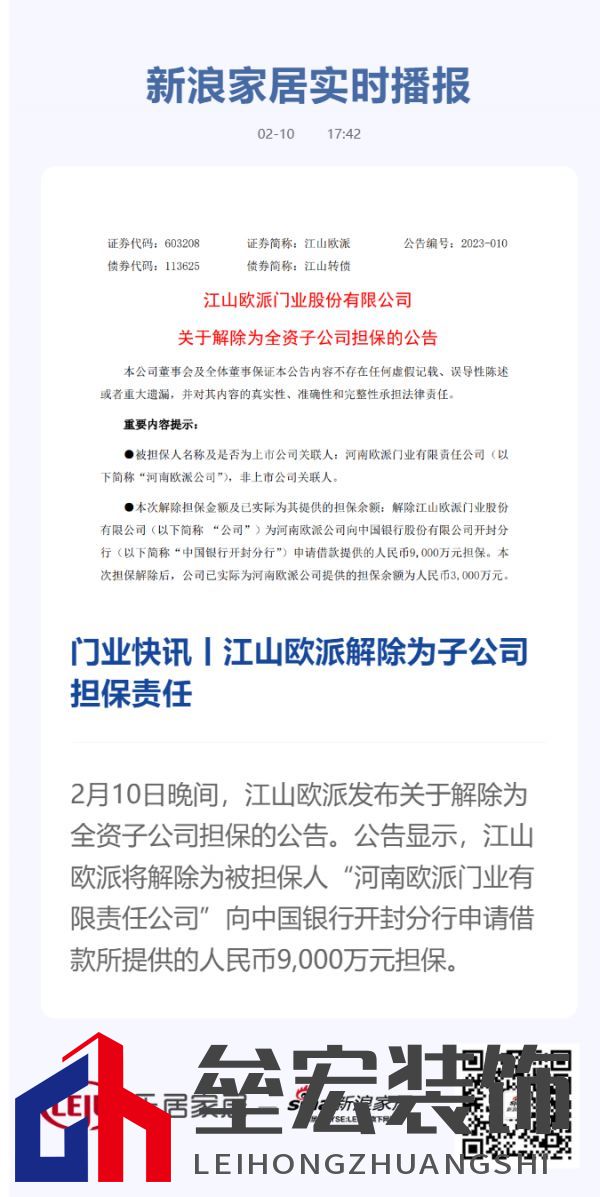 ??2月10日晚間,江山歐派發(fā)布關(guān)于解除為全資子公司擔保的公告。公告顯示,江山歐派將解除為被擔保人“河南歐派門業(yè)有限責任公司”向中國銀行開封分行申請借款所提供的人民幣9,000萬元擔保。