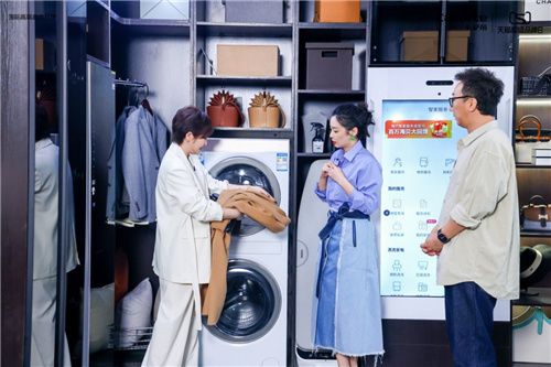 體驗(yàn)完新一代廚房,丁丁張?zhí)岢龈叨嗣媪想y以護(hù)理的問題,而方齡現(xiàn)場(chǎng)為她們推薦了卡薩帝洗衣機(jī)。三人走進(jìn)衣帽間,高葉將一件羊毛面料的衣物放進(jìn)洗衣機(jī)后,通過“養(yǎng)護(hù)空氣洗”的護(hù)理很快恢復(fù)了柔順質(zhì)感和最初色彩?!氨话怖搅?,這個(gè)功能不錯(cuò),還不用水洗!”對(duì)于經(jīng)常換裝、出席活動(dòng)的高葉來說,高端面料衣物多、換衣勤,而卡薩帝洗衣機(jī)能讓她輕松擁有精致生活。 來到智慧客廳,三人坐在沙發(fā)上暢聊女性話題,體驗(yàn)居家時(shí)光的愜意和舒適。在冰吧中取出水果、飲品,一句話喚醒空調(diào),可以體驗(yàn)到適合每個(gè)人的專屬空氣,同時(shí)享受一場(chǎng)影院級(jí)音畫效果的電影。隨后在插花、泡茶的間隙,高葉還分享了她日常起居時(shí)的放松方式,泡澡時(shí)放音樂,配合香薰精油按摩……這些方式不但有效改善睡眠,更讓她舒適享受完美的一天。而卡薩帝熱水器、烘干機(jī)等卡薩帝家電都能幫助她們及時(shí)發(fā)現(xiàn)藏在生活里的美。