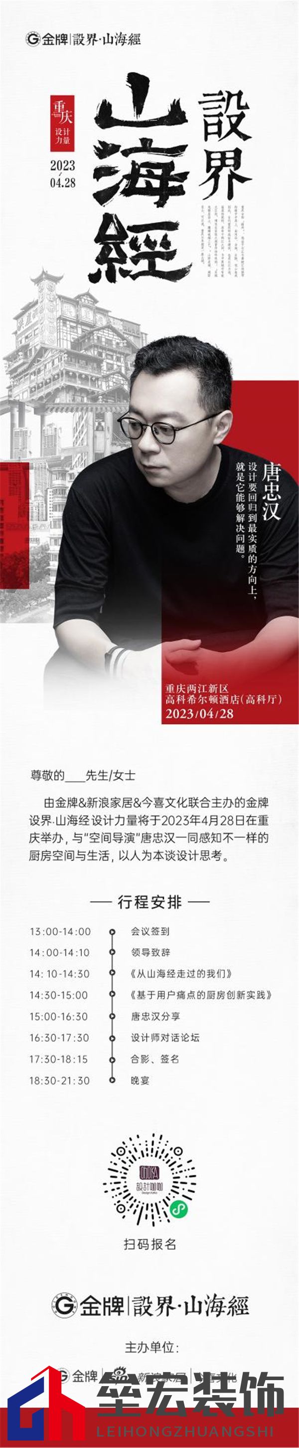 往期回顧 ??踏入2023年,《設(shè)界·山海經(jīng)》系列設(shè)計活動在奇幻山城重慶重磅啟航,將帶來更為精彩紛呈的活動,再度開啟一場融合品牌、設(shè)計與藝術(shù)的創(chuàng)意靈感之旅! ??正如金牌廚柜總裁潘孝貞所言:“我希望設(shè)計師交流不局限于一場演講或一次頒獎,而是深入了解一個城市的文化和生活,多個角度獲取設(shè)計啟發(fā)和靈感,做有文化傳承和地域特色的設(shè)計,不斷推動中國設(shè)計創(chuàng)新,為城市居民帶來美好生活。” ??攜手大咖唐忠漢,賦能中國整家空間美學(xué)變革 ??近境制作創(chuàng)始人·設(shè)計總監(jiān)、中國室內(nèi)設(shè)計十大年度人物、中國空間陳設(shè)行業(yè)領(lǐng)軍人物、Andrew Martin國際設(shè)計大獎得主唐忠漢先生,一直提倡透過室內(nèi)建筑的方式,體驗空間、光影、材質(zhì)、細(xì)節(jié),透過以人為本的思考,探索現(xiàn)代住宅的生活方式,回歸真實的需要。以此為出發(fā),唐忠漢打造了一系列經(jīng)典之作,被譽為“空間導(dǎo)演”,讓住宅不僅是滿足基本的需求,而是到達(dá)體驗的感受,看到的不僅是設(shè)計,而是對于生活的深刻體會。