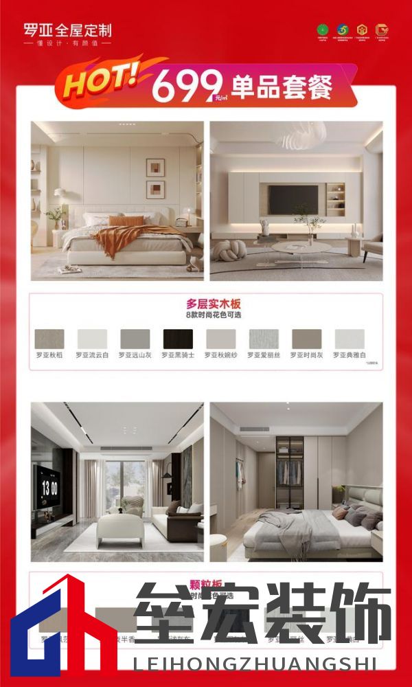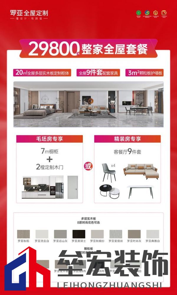 29800元整家全屋套餐,毛坯/精裝一口價(jià)配齊 相比于市場上同類套餐,購買羅亞全屋定制柜/護(hù)墻板/定制木門,實(shí)現(xiàn)流行的柜墻門一體化設(shè)計(jì),僅需29800元一價(jià)配齊,極具“質(zhì)價(jià)比+心價(jià)比”優(yōu)勢;同時(shí),柜墻門一體化搭配,無需操勞奔波建材市場每家比較,也不用擔(dān)心花色、風(fēng)格、售后服務(wù)沖突等一系列煩事,省時(shí)又省心。此外,該套餐分別針對毛坯房和精裝房,配置了不同的套餐內(nèi)容。 29800元整家全屋套餐=20㎡全屋多層實(shí)木板定制柜體+3㎡顆粒板護(hù)墻板+7m櫥柜+2樘定制木門(毛坯房專享)或20㎡全屋多層實(shí)木板定制柜體+3㎡顆粒板護(hù)墻板+客餐廳9件套(精裝房專享),一個(gè)套餐就能將柜、墻、門等產(chǎn)品一站配齊,真正實(shí)現(xiàn)“一家搞定,一價(jià)配齊,一體設(shè)計(jì)”。