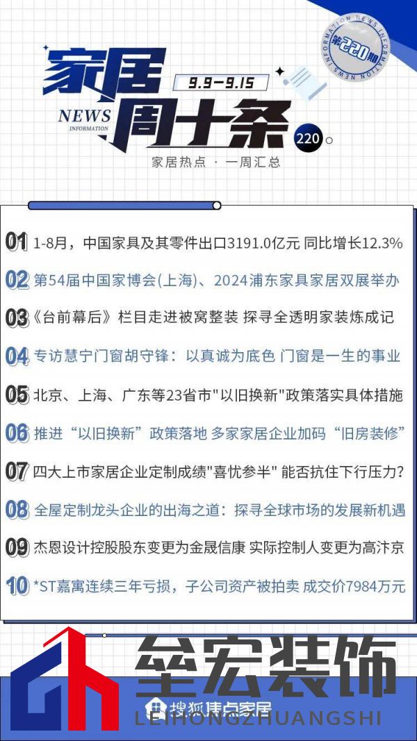 |  01 1-8月,中國家具 出口3191.0億元 同比增長12.3% 據(jù)海關(guān)總署9月10日發(fā)布的數(shù)據(jù),2024年8月,我國家具及其零件出口額為345.3億元,去年8月出口額為363.0億元,同比減少4.9%。 此外,1至8月,家具及其零件出口額為3,191.0億元,去年同期為2,841.8億元,同比增長12.3%;陶瓷產(chǎn)品出口額為1,021.2億元,去年同期為1,168.9億元,同比下降12.6%。 02 第54屆中國家博會(上海) 2024浦東家具家居雙展舉辦 9月11日,第54屆中國家博會(上海)于上海虹橋·國家會展中心盛大開幕。作為中國對外貿(mào)易中心集團旗下品牌旗艦展會,中國家博會(上海)以“設(shè)計賦能,內(nèi)外雙驅(qū)”為主題,致力打造中國家居商業(yè)設(shè)計第一展。  本屆展覽規(guī)模達30萬平方米,匯聚顧家、悍高、泰普森、M&D、LAZBOY樂至寶、夢百合、絲漣、HC28|都匯里、幾間等超1300家參展企業(yè)。  9月13日15時,第二十九屆中國國際家具展覽會中國家具高端制造展FMC China 20242024摩登上海時尚家居展(簡稱“2024浦東家具家居雙展”)在上海新國際博覽中心和世博展覽館圓滿閉幕。  最新數(shù)據(jù)顯示:2024年浦東家具家居雙展參觀共計167,205 人次。其中海外28,644人次,在去年5天變成今年4天展期的情況下,仍實現(xiàn)了同比去年增長11.9%!新展商占比超過1/3達到1010家,10年以上參展商488家,共同推動行業(yè)革新與可持續(xù)發(fā)展。  03 臺前幕后|第二季 第2期 探尋“不怕踩雷的全透明家裝” 搜狐焦點家居攜手保利管道,帶來關(guān)于家裝的幕后故事,并聯(lián)手打造《臺前幕后》欄目,致敬家裝領(lǐng)域幕后英雄。本期臺前幕后就帶大家揭秘一家真正能做到“透明每一步”的整裝公司——被窩整裝。  被窩整裝注重裝修的透明與品質(zhì),更重視每一位業(yè)主的滿意度,“十心實意安信服務(wù)”,被窩兜底,說到做到!具體而言,報價透明,告別惡意增項;材料正品,從廠到家實時追蹤;施工透明,360°無死角監(jiān)控;匠心獨運,細節(jié)決定品質(zhì)。 04 慧寧門窗董事長胡守鋒: 真誠為人生底色,聚焦門窗成就一生事業(yè) 搜狐焦點家居特別策劃欄目《掌門人》 ,對話慧寧門窗董事長胡守鋒先生,聽他分享從零開始的創(chuàng)業(yè)歷程與企業(yè)未來愿景,并深度剖析行業(yè)發(fā)展趨勢與市場洞察,揭示慧寧門窗如何在激烈的市場競爭中憑借獨特的策略和穩(wěn)健的步伐脫穎而出。 胡守鋒表示:“未來能夠在行業(yè)中生存和發(fā)展的企業(yè)必定是誠信經(jīng)營、具有良心的企業(yè)。市場的淘汰賽已開始,企業(yè)必須穩(wěn)扎穩(wěn)打,不斷提升自身的綜合能力?!?/p>  自創(chuàng)立以來,慧寧門窗始終秉持“一厘米寬,一萬米深”的發(fā)展理念,以高標(biāo)準(zhǔn)要求自己,致力于為消費者提供智能、節(jié)能、安全的高性能系統(tǒng)門窗產(chǎn)品。  展望未來,胡守鋒堅信,慧寧門窗將在行業(yè)責(zé)任感和持續(xù)創(chuàng)新的驅(qū)動下,繼續(xù)引領(lǐng)行業(yè)發(fā)展,邁向更加輝煌的明天。正是這種堅定的信念和持續(xù)的努力,慧寧門窗將在未來的發(fā)展中書寫新的輝煌篇章。 05 23省市“以舊換新”政策落實具體措施 涉智能馬桶、淋浴房、花灑... 今年三月,國務(wù)院發(fā)布了《推動大規(guī)模設(shè)備更新和消費品以舊換新行動方案》以來,“以舊換新”政策收到廣大行業(yè)人士的關(guān)注,聚焦在相關(guān)補貼政策如何落地。目前,隨著“以舊換新”政策的逐步落實,全國23個包括北京、上海、廣東、福建、湖南、等省市陸續(xù)出臺相關(guān)落地政策。  8月26日 ,北京發(fā)布《積極推進家裝以舊換新工作方案》。9月2日,上海市商務(wù)委等六部門關(guān)于印發(fā)《上海市加力支持綠色智能家電家居消費補貼政策》的通知 。此外,廣東聚焦綠色、智能、適老,對消費者購買舊房裝修和廚衛(wèi)等局部改造、居家適老化改造所用物品和材料給予補貼,促進智能家居消費。 06 推進“以舊換新”政策落地 多家企業(yè)加碼“舊房裝修” 近日,上海印發(fā)《消費品以舊換新工作實施方案》,其中提到,對家居消費按照銷售價格的15%予以補貼。值得注意的是,此次上海市重點提到了針對“舊房裝修改造”開展專屬補貼。  業(yè)內(nèi)人士表示,家裝以舊換新對存量房產(chǎn)的發(fā)展有著重大的推動作用,同時家裝本身就是一個“大家居”概念的產(chǎn)業(yè)鏈,鏈條非常長,也將帶動多產(chǎn)業(yè)鏈發(fā)展。 07 四大上市企業(yè)定制成績喜憂參半 能否抗住下行壓力? 受上游房地產(chǎn)行業(yè)的快速調(diào)整影響,消費信心也尚待進一步恢復(fù),包括全屋定制在內(nèi)的家居行業(yè)短期壓力加大。顧家家居、兔寶寶、大亞圣象、華帝股份四大上市公司,近年均在跨界定制業(yè)務(wù)。以2024上半年的營收指標(biāo)看,顧家、圣象同比實現(xiàn)增長,兔寶寶和華帝業(yè)績下滑。 隨著家居消費趨勢的變化,企業(yè)間的競爭由單品轉(zhuǎn)向全屋,日趨白熱化的態(tài)勢有增無減。業(yè)內(nèi)人士分析 提升客單值把流量價值最大化是未來的發(fā)力點,而裝企渠道、海外市場、差異化產(chǎn)品以及電商模式等成為新的增長突破口。 08 全屋定制龍頭企業(yè)的出海之道: 探尋全球市場的新機遇 在“出海”浪潮中,定制家居領(lǐng)域的企業(yè)表現(xiàn)