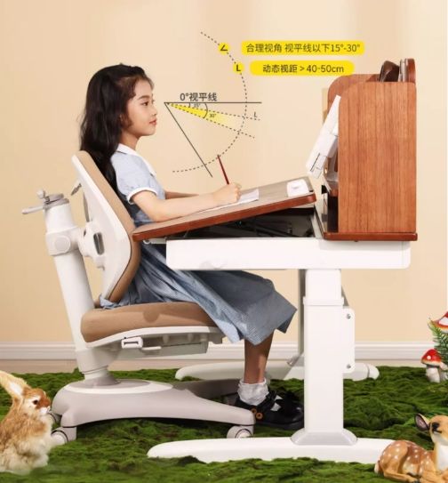 ??3. 視距管控與用眼健康 ??搭配多功能閱讀架,孩子可遠(yuǎn)看近寫,切換視距,通過“抬頭看書、低頭寫字”模式鍛煉睫狀肌調(diào)節(jié)能力,緩解視疲勞。實(shí)驗(yàn)證明,使用該設(shè)計(jì)后,兒童平均視距從25厘米增至33厘米以上,完美契合政策中“書本離眼一尺”的硬性要求。