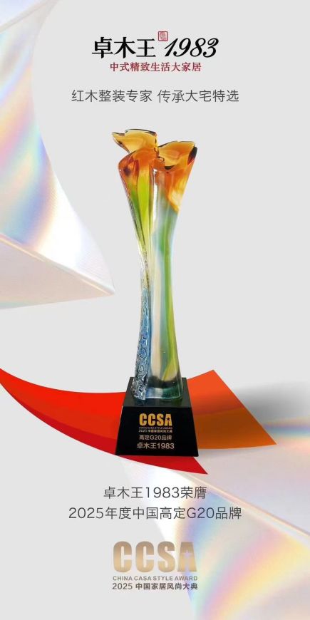 2025年7月8日,在萬眾矚目的“萬福倉之夜——致敬高定十年·第十屆CCSA家居風尚大典暨2025高定十年G20+頒獎禮”上,紅木整裝創(chuàng)lin品牌卓木王再度榮膺“高定G20品牌大獎”。 作為“紅木整裝世家 傳承祖宅首選”品牌,卓木王已連續(xù)幾年蟬聯(lián)此項行業(yè)頂ji榮譽,卓木王持續(xù)獲得行業(yè)高度認可,穩(wěn)居中式高定標桿地位。