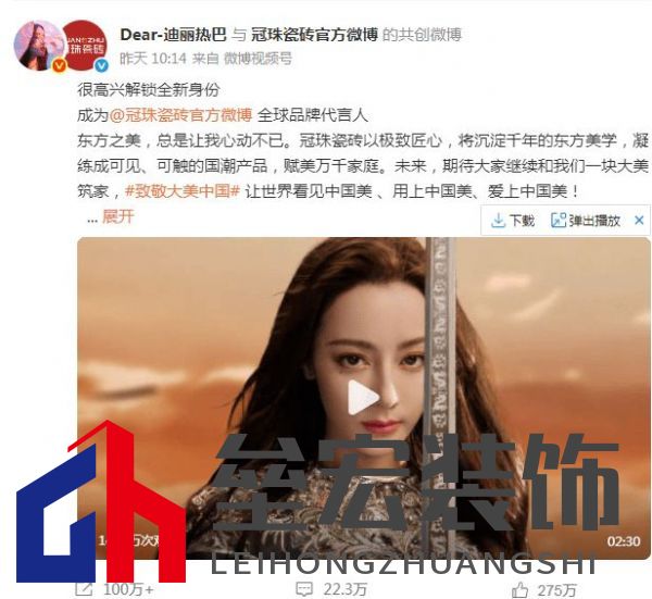 2025年7月30日,冠珠瓷磚攜手全球品牌代言人迪麗熱巴開啟筑家美學新章,2025品牌宣傳片全新上映,致力以一場穿越時空的美學對話,深耕中國美的深度,探索世界美的高度,以迭代的中國美豐盈筑家美學,與全球消費者共鳴、共享、共進!品牌宣傳片上映一天就獲得千萬播放,熱度持續(xù)上漲!