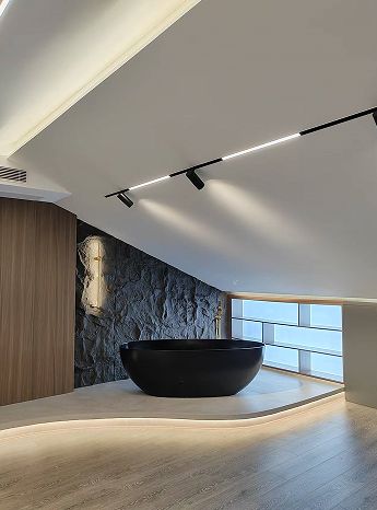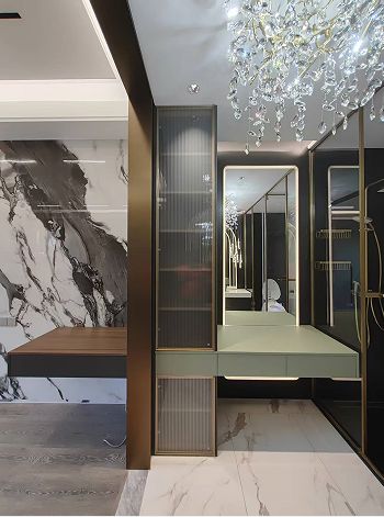 ??KD511:今年的項(xiàng)目在設(shè)計(jì)過(guò)程中,針對(duì)業(yè)主的個(gè)性化需求做了哪些特別設(shè)計(jì)? ??設(shè)計(jì)師 黃寧:個(gè)性化表達(dá),讓獨(dú)特需求獲得恰如其分的呈現(xiàn)。 ??真正的個(gè)性化設(shè)計(jì),不在于刻意的標(biāo)新立異,而在于對(duì)個(gè)體特質(zhì)的精準(zhǔn)回應(yīng)。我們不制造夸張的場(chǎng)景,而是將業(yè)主的生活偏好轉(zhuǎn)化為空間語(yǔ)言的精確表達(dá)。例如去年我們完成的一個(gè)美妝博主位于中海岳麓山的上疊別墅,客戶喜愛的意式暗黑輕奢風(fēng)格,在材料選擇與工藝處理上,我們選擇了柔光的魚肚金地磚呈現(xiàn)空間的通透,墻面則用的進(jìn)口蛋殼光的深灰色漆面體現(xiàn)暗黑輕奢的質(zhì)感。特意為美女主播設(shè)計(jì)定制圓形線條背景墻,精致細(xì)膩的線條造型,搭配兩側(cè)拉絲金的全鋁板金屬開架,成為直播拍攝時(shí)的完美背板。沒有刻意的戲劇化呈現(xiàn),卻讓每個(gè)細(xì)節(jié)都恰如其分 —— 這正是高還原度的高級(jí)形態(tài):讓個(gè)性自然生長(zhǎng)于空間肌理之中。