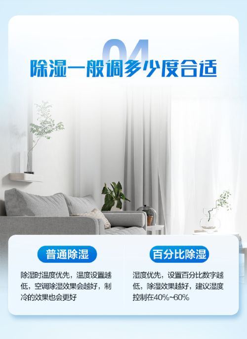 ??四、除濕一般調(diào)多少度合適 ??普通除濕:除濕時(shí)溫度優(yōu)先,溫度設(shè)置越低,空調(diào)除濕效果會(huì)越好,制冷的效果也會(huì)更好。 ??百分比除濕:濕度優(yōu)先,設(shè)置百分比數(shù)字越低,除濕效果越好,建議濕度控制在40%~60%。