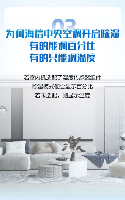 ??三、為何海信中央空調(diào)開啟除濕,有的能調(diào)百分比,有的只能調(diào)溫度 ??若室內(nèi)機(jī)選配了濕度傳感器組件,除濕模式便會(huì)顯示百分比。若未選配,則顯示溫度。