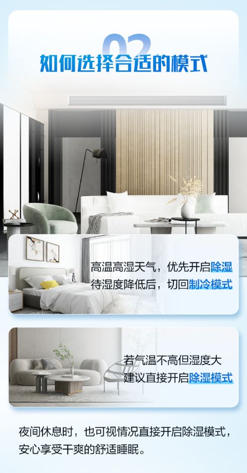 ??二、如何選擇合適的模式 ??高溫高濕天氣,優(yōu)先開啟除濕 ??待濕度降低后,切回制冷模式 ??若氣溫不高但濕度大,建議直接開啟除濕模式。 ??夜間休息時(shí),也可視情況直接開啟除濕模式安心享受干爽的舒適睡眠。
